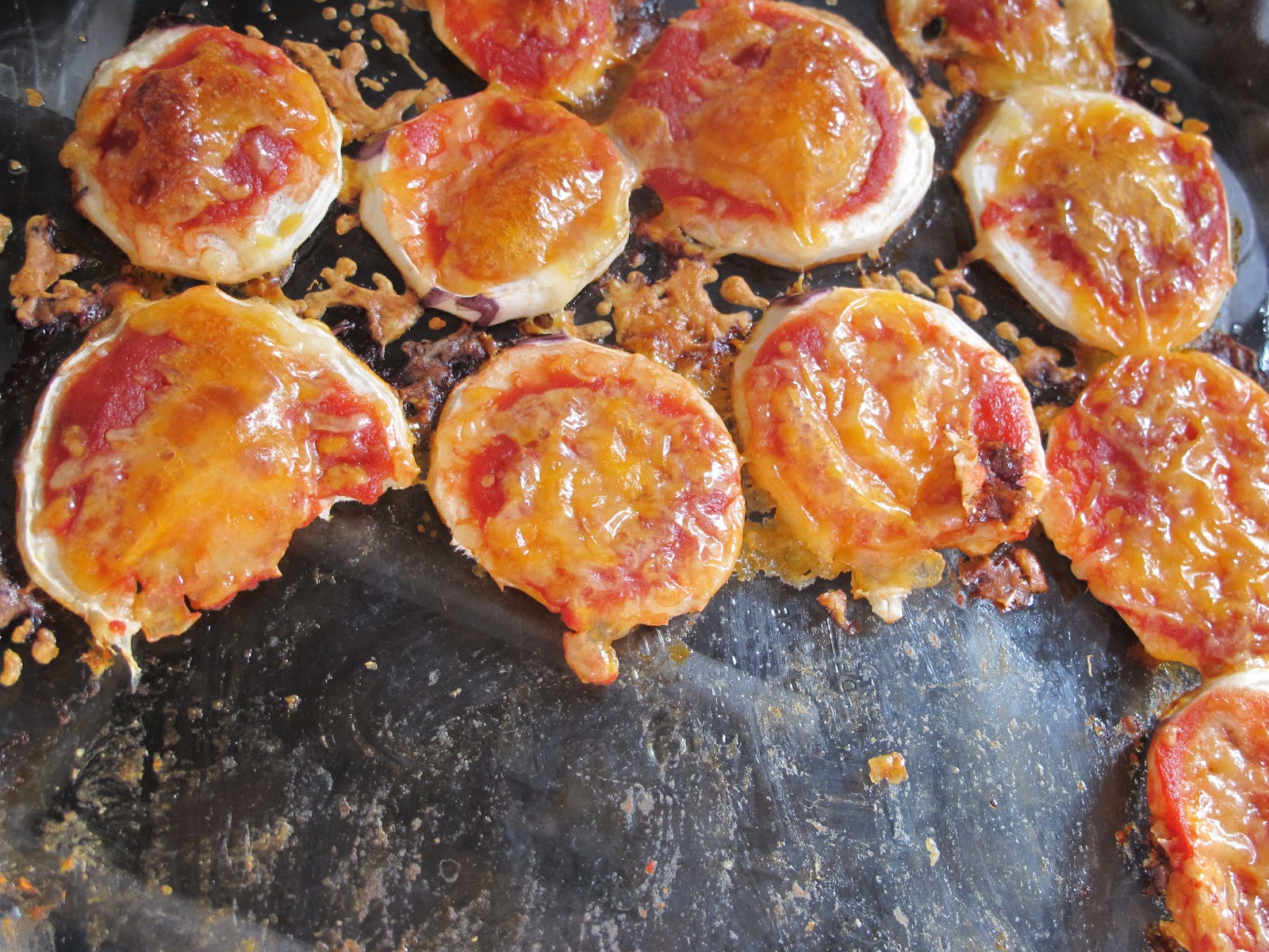 Put a little sauce, or a lot if you like a lot, on each round of eggplant and smoosh it around.