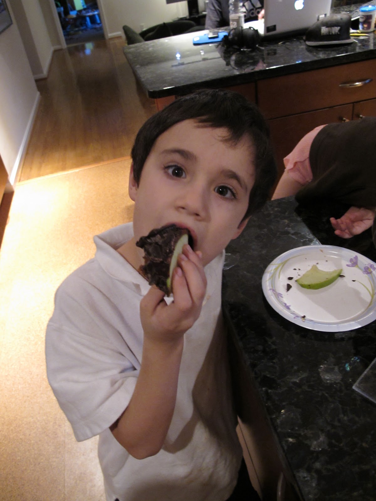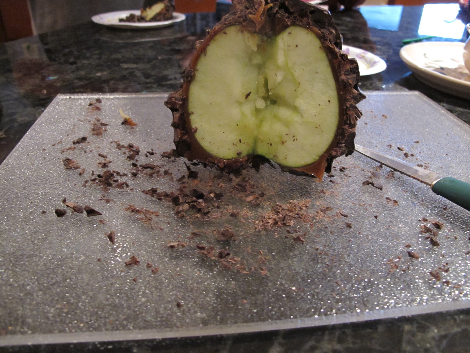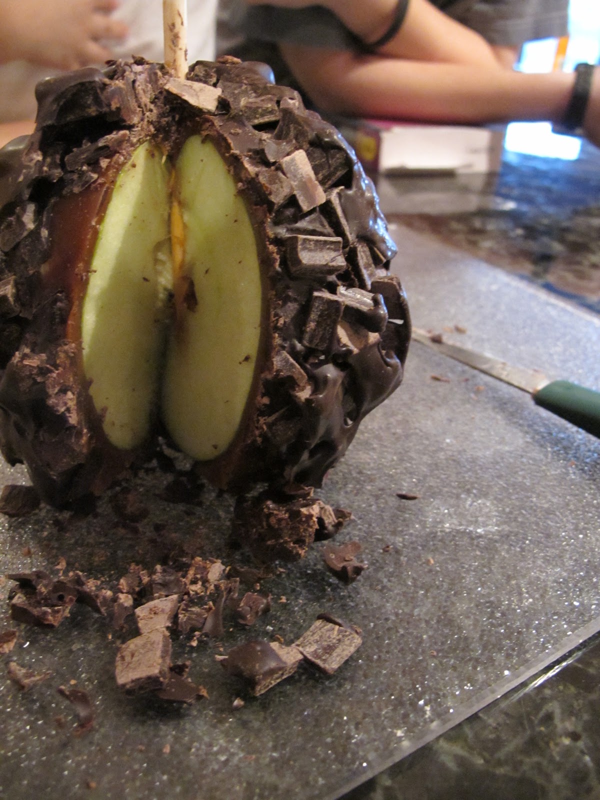 I made one small cut and tons of chocolate fell off. These pieces were quickly eaten up by the 5 waiting kids. After one more slice we had our first piece cut out. Again, many pieces of chocolate fell off, but the kids did not care, they just wanted to eat it. Each piece seemed to make more chocolate fall off but the chocolate was yummy on or off the apple as the kids explained to me.