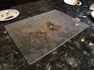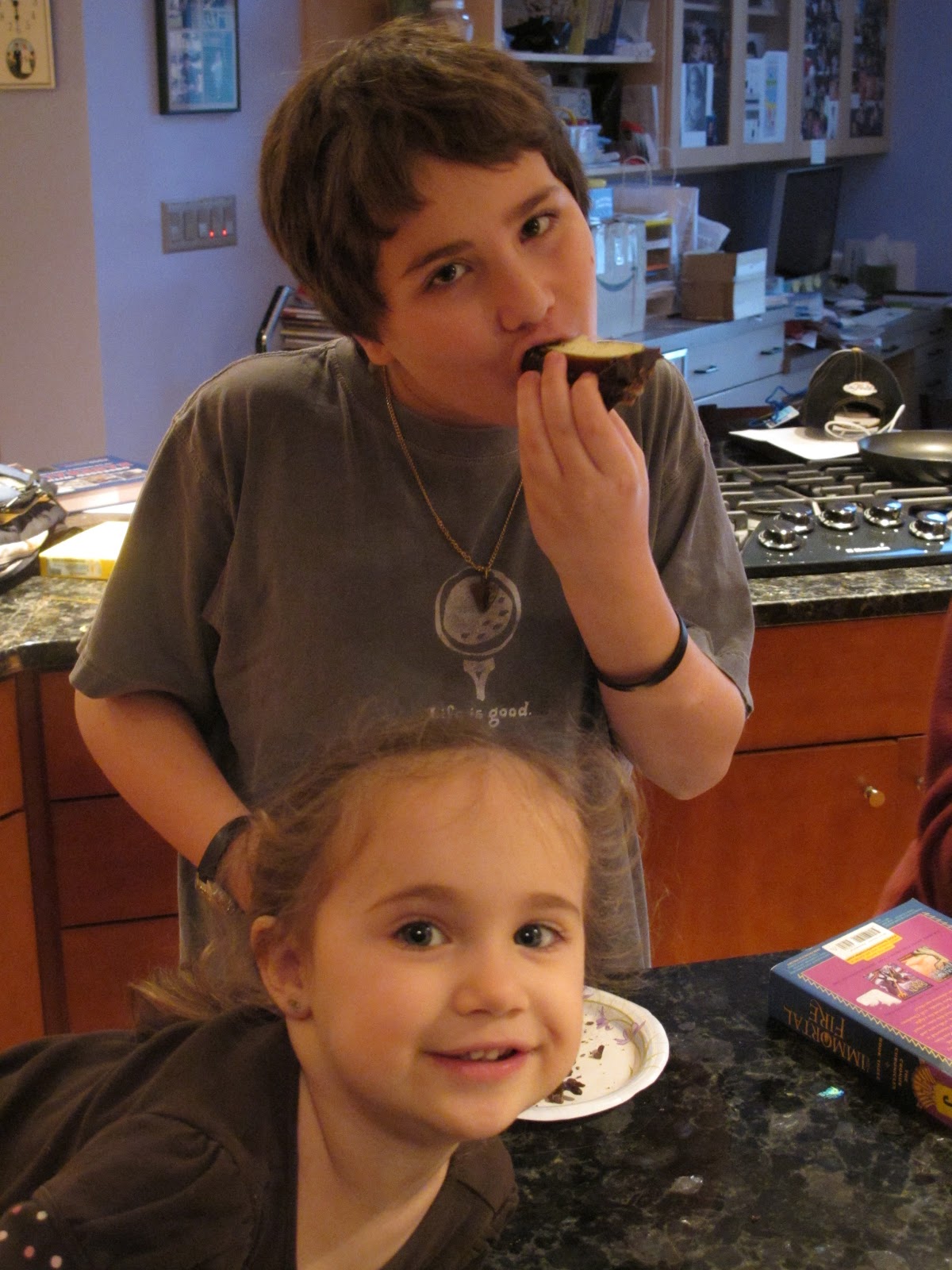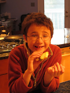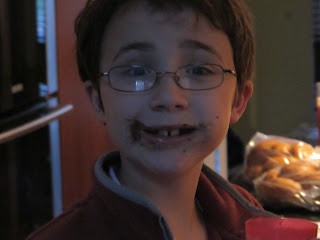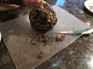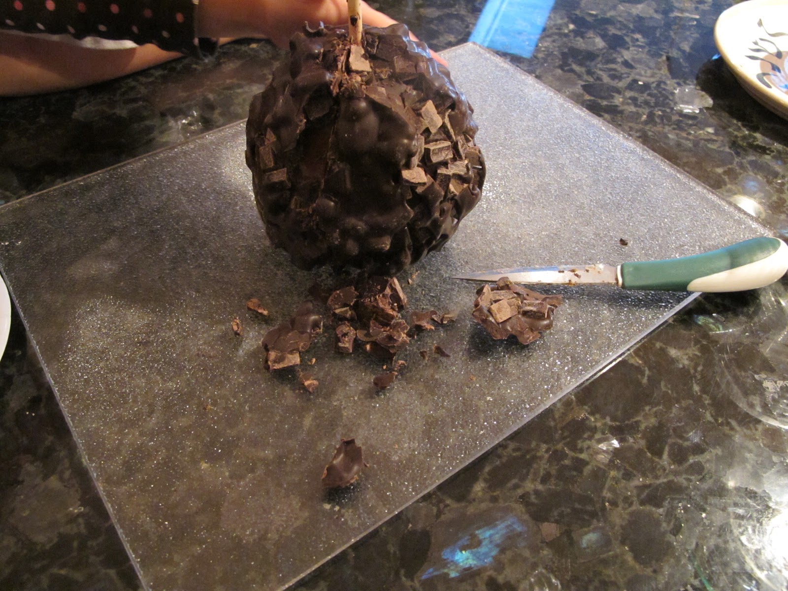 I made one small cut and tons of chocolate fell off. These pieces were quickly eaten up by the 5 waiting kids. After one more slice we had our first piece cut out. Again, many pieces of chocolate fell off, but the kids did not care, they just wanted to eat it. Each piece seemed to make more chocolate fall off but the chocolate was yummy on or off the apple as the kids explained to me.