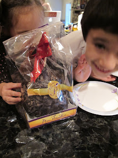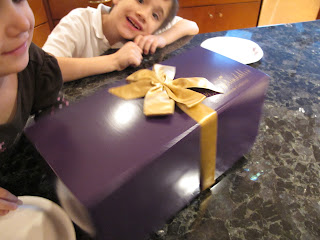 We opened up the white box to find a beautiful purple box tied with a gold ribbon. The kids were starting to get delirious, open the box faster Mom!! We want to eat what is inside!