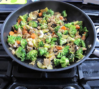 - I usually put the onions in alone for the first 2-3 minutes and then add in the rest of the veggies. Once these are cooked (about 2-3 more minutes) I add in chopped up seitan.