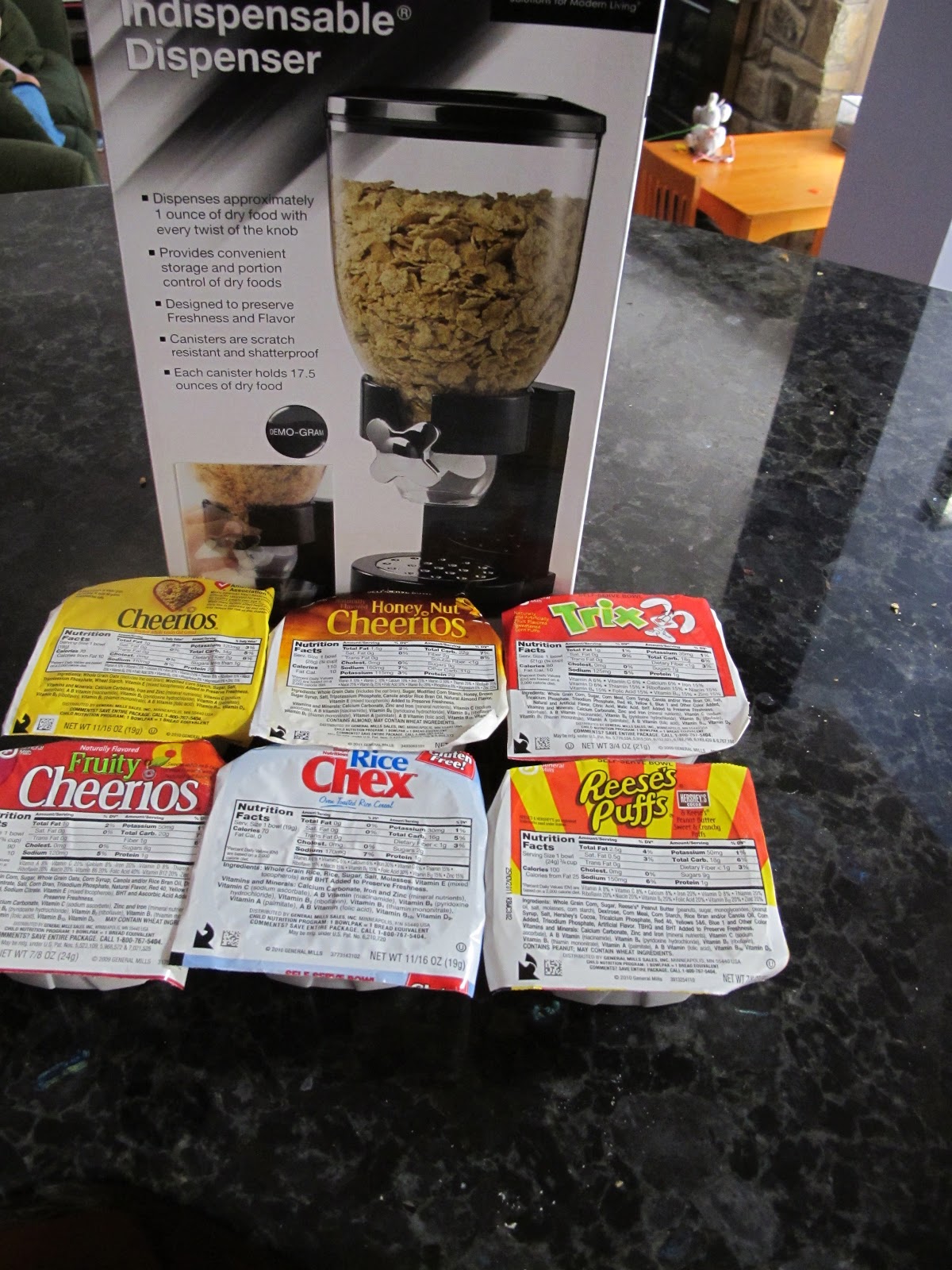 Just for reading my blog, General Mills would like to offer one winner a great prize this week. You will get 6 cereal bowl boxes of cereal. My kids love these, especially on trips when you might not have a seperate bowl. The cereal dispenser has also been a huge hit in my house! It is easy enough to use for my 3 year old by herself and it encourages snacking throughout the day. All of my kids are eating more cereal thanks to this dispenser. Would you like to win one of your own??