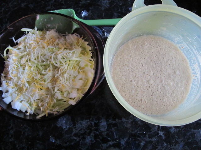 Grate 3 medium zucchini into a bowl. Add into that same bowl 1/2 of a small onion, diced and 1/4 cup 3 cheese blend. It should look like this: