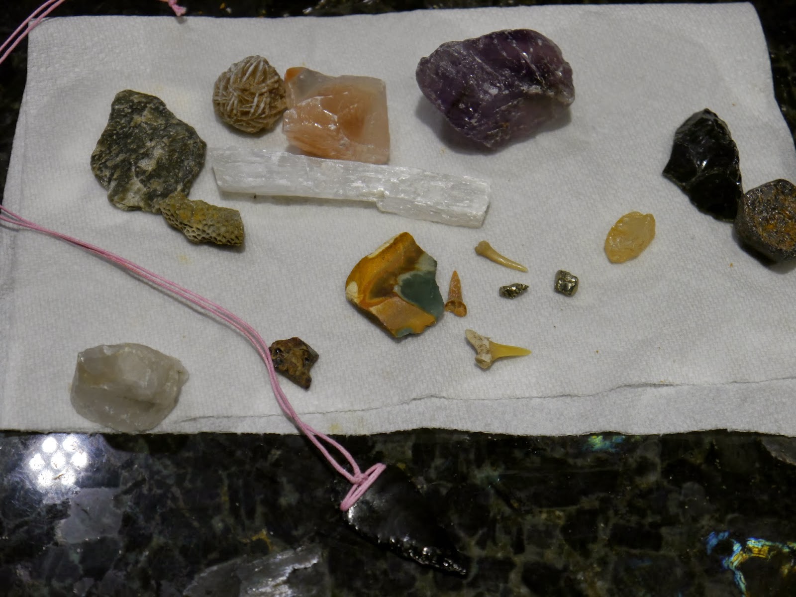 This photo shows all the goodies that Diane found. Whoever found an arrowhead had the option to make it into a necklace. Suprised that we came home with a pink arrowhead necklace?? Me neither.